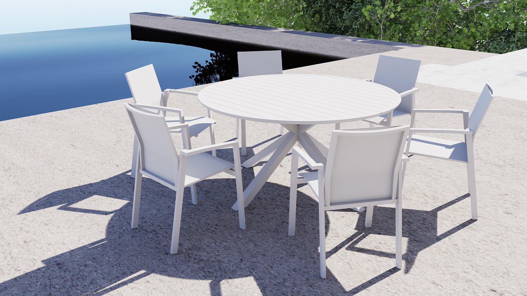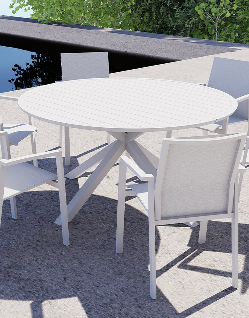 Preciosa mesa de exterior redonda extensible fabricada en aluminio de color blanco.