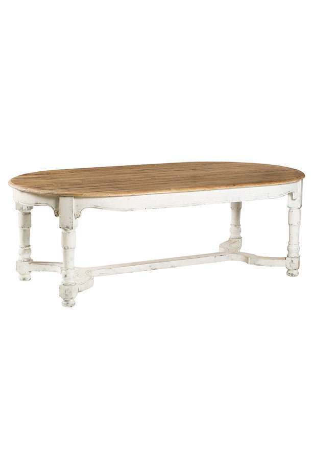 Preciosa mesa de comedor ovalada con tapa en madera de pino rústica y reciclada color natural y patas en color blanco.
