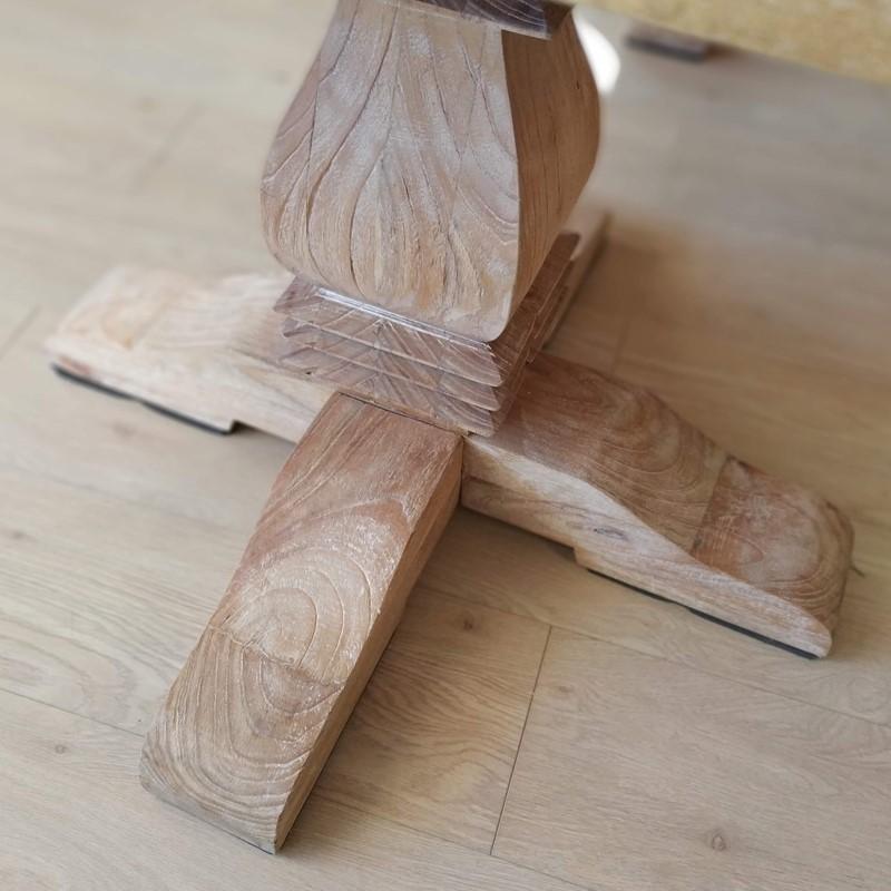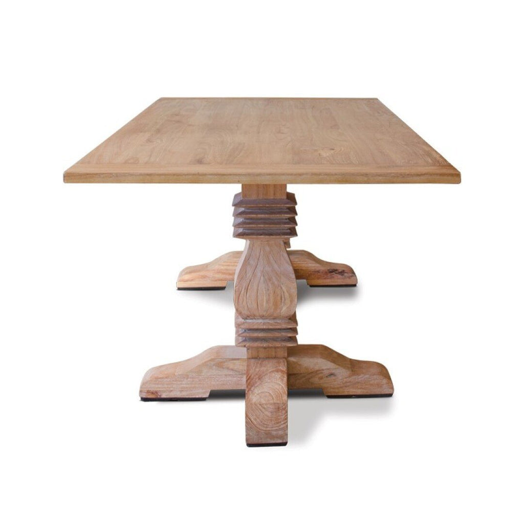 Mesa de comedor u oficina rectangular fabricada en madera maciza color natural. Las patas están decoradas y torneadas.