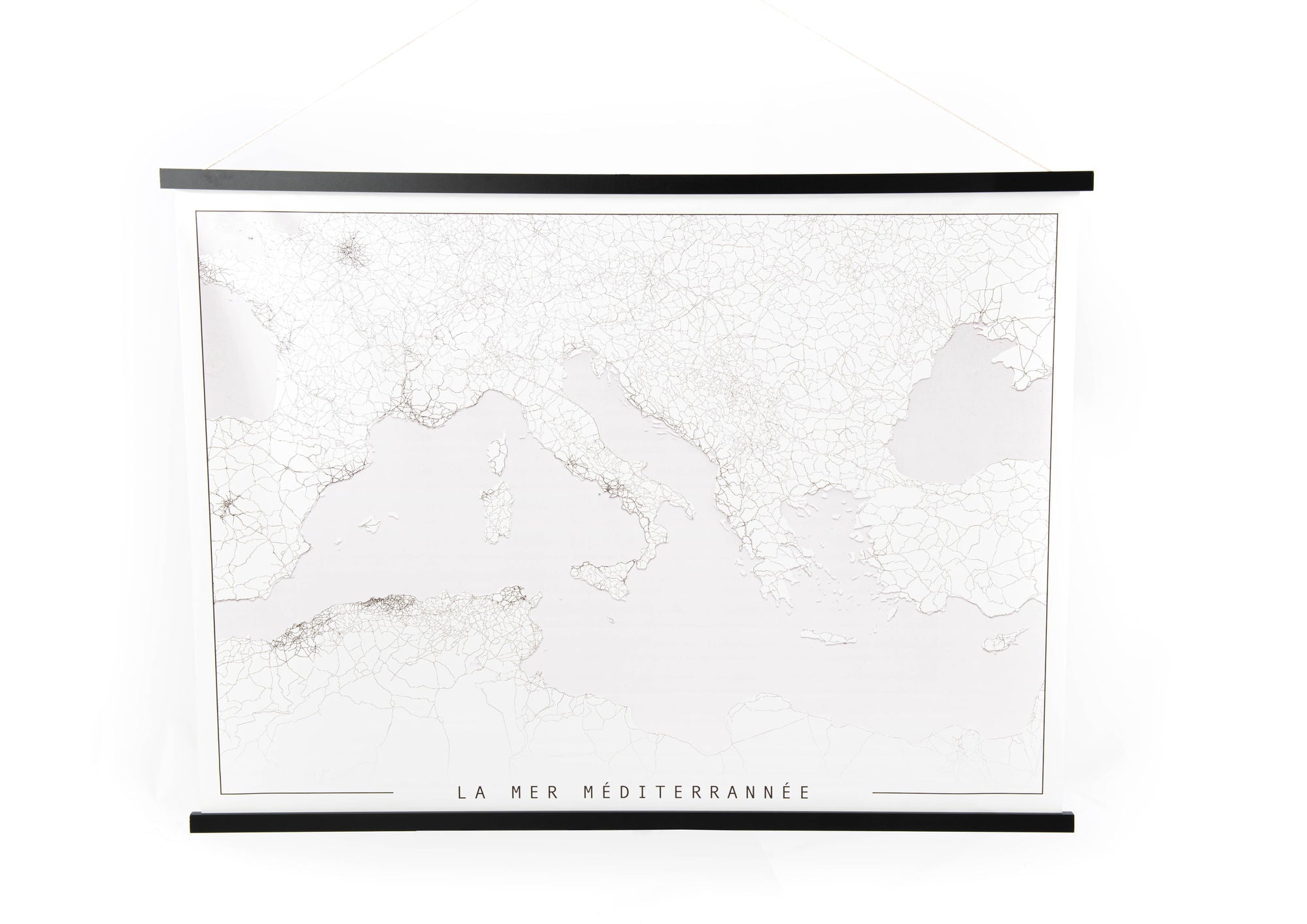 Mural de lona con motivo del mar mediterráneo y países limítrofes con madera de color negro en la parte superior e inferior.