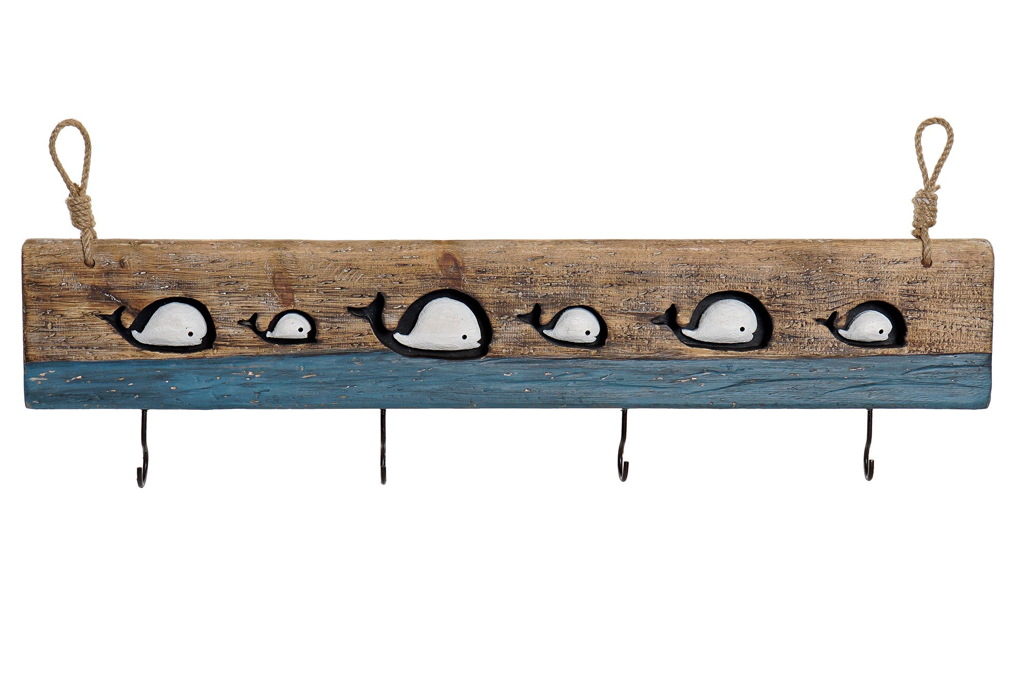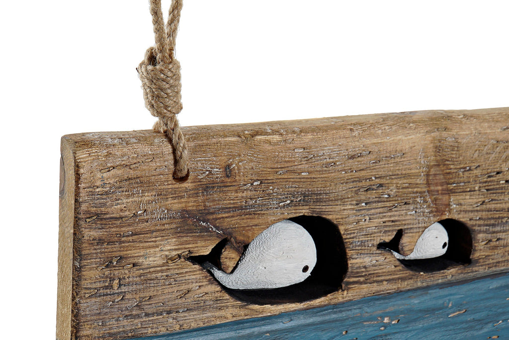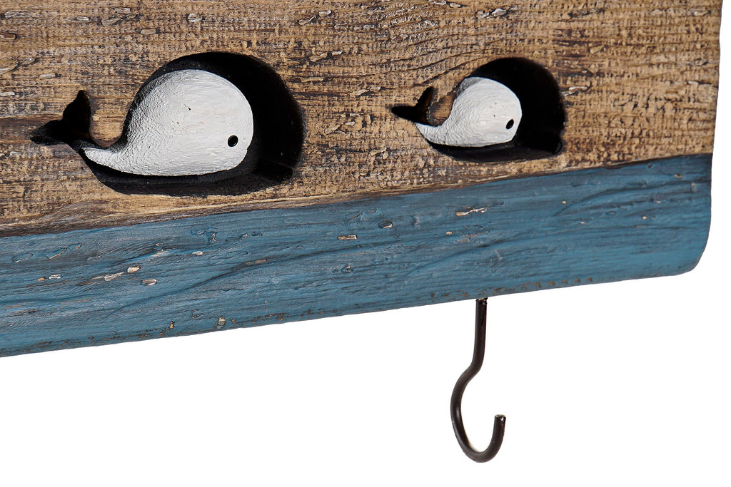Original perchero de madera y metal en color azul, blanco, negro y natural con detalle de colgadores en cuerda.