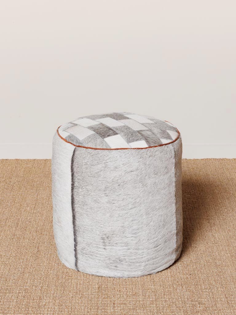 Precioso puff fabricado en piel de vacuno y cuero color gris con ribete de color marrón en el asiento.