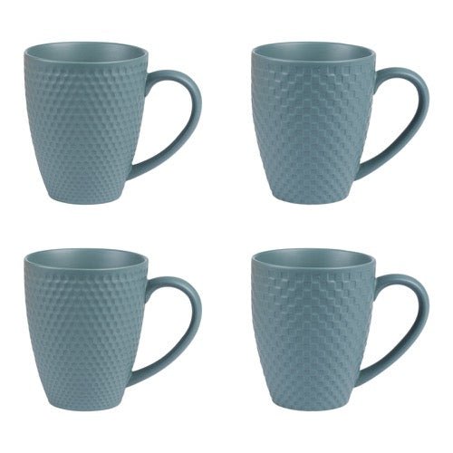 Un set de cuatro tazas de porcelana fina en tono azul verdoso, realzado con delicados relieves que aportan textura y distinción. Su diseño atemporal combina la ligereza y resistencia de la porcelana con un acabado artesanal que invita a disfrutar cada sorbo, ya sea en un desayuno tranquilo o en una reunión especial.