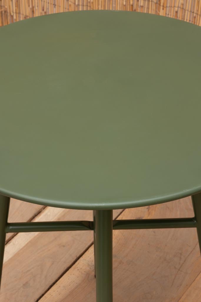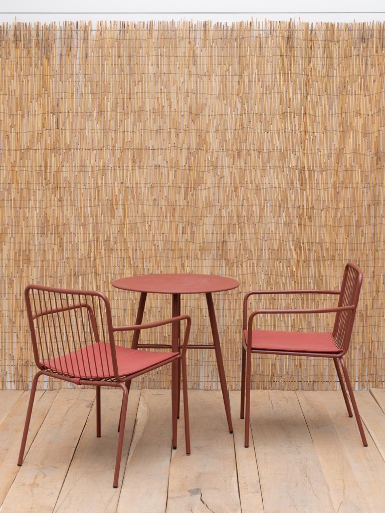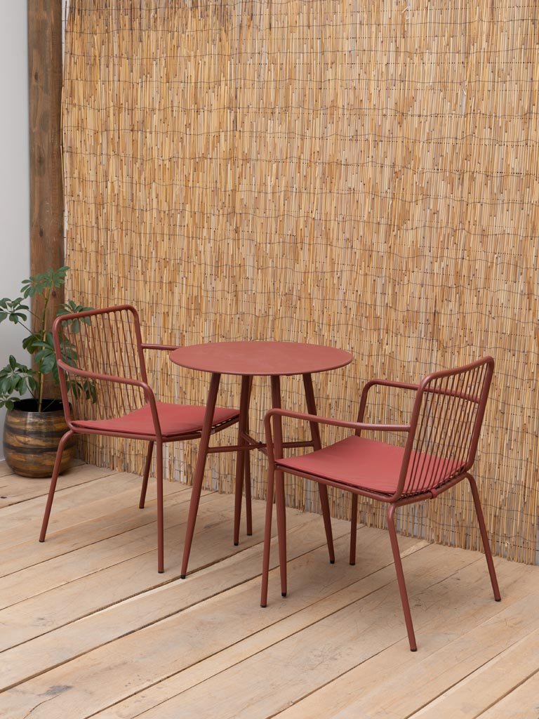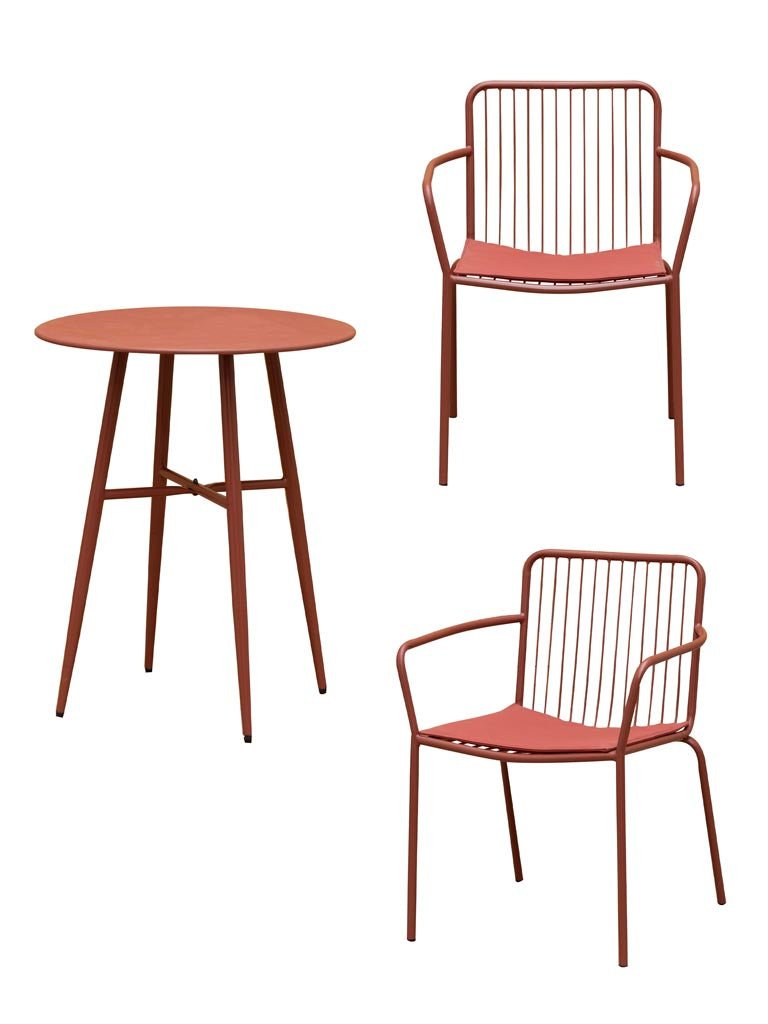 Precioso conjunto de mesa y dos sillas fabricadas en hierro color verde, rojo y azul.