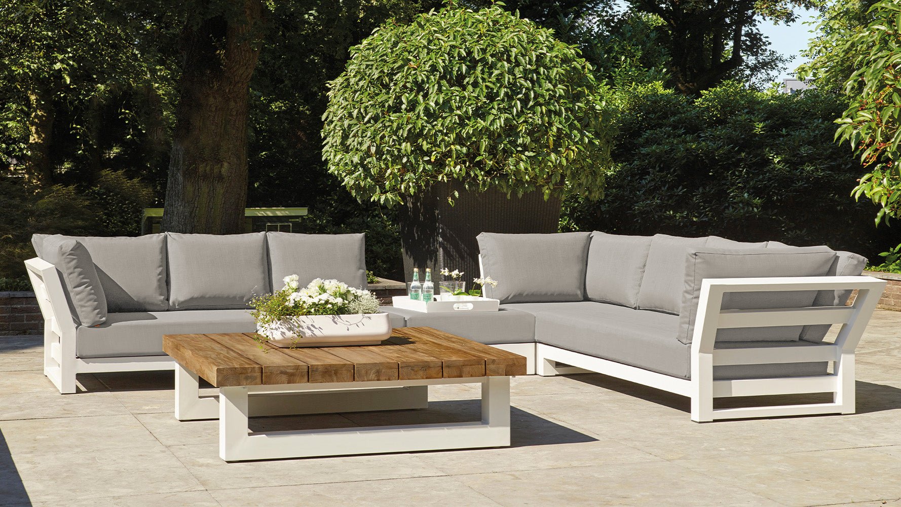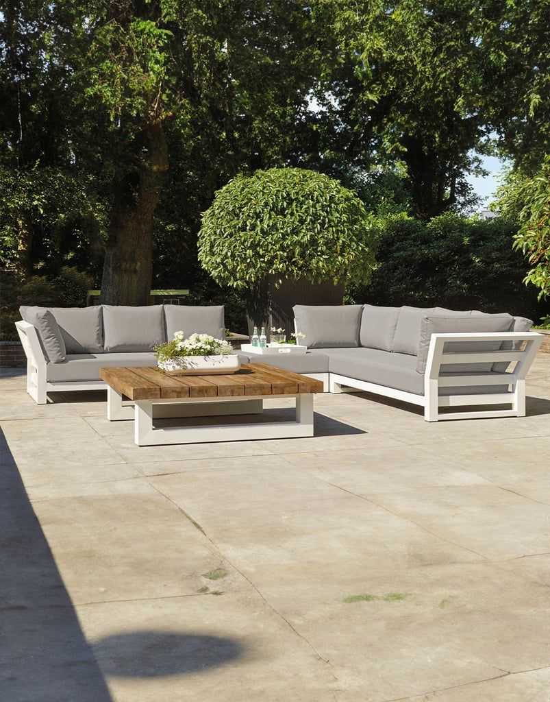 Set de sofá y mesa de exterior fabricado en aluminio blanco con cojines en poliéster color gris y mesa con tapa de madera color natural.