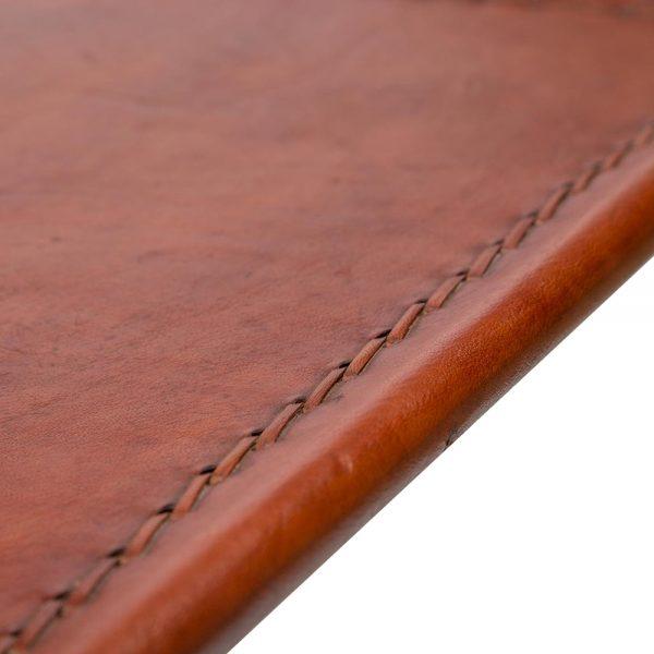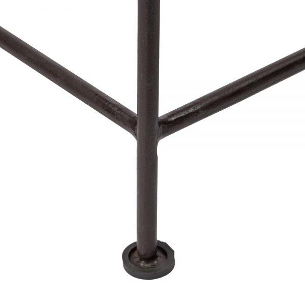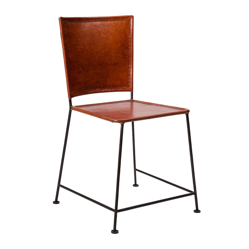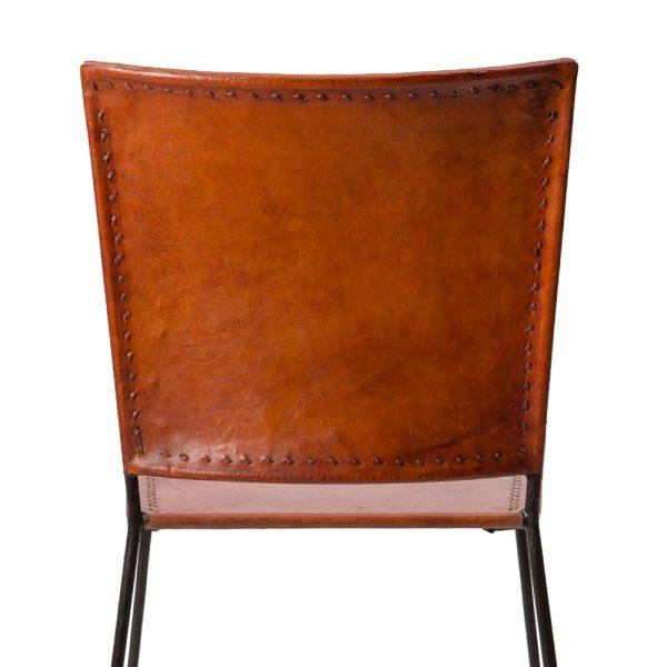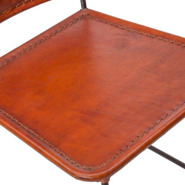 Silla con estructura de hierro color negro y asiento y respaldo tapizado en piel color marrón.