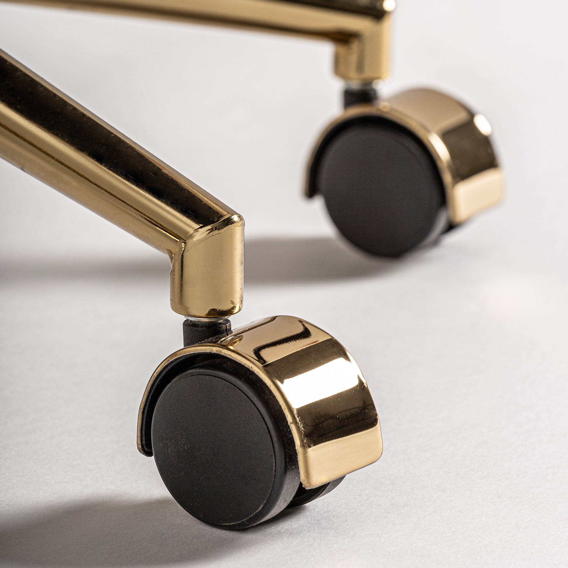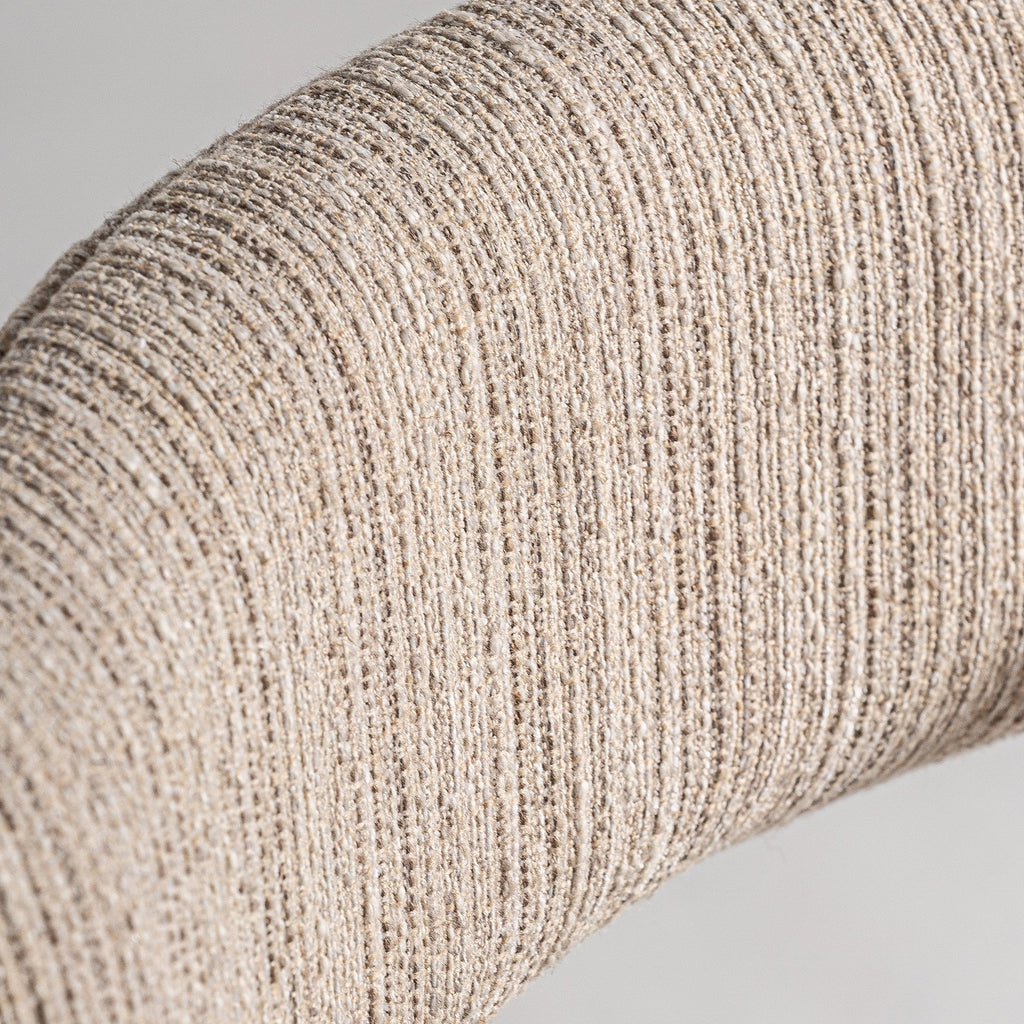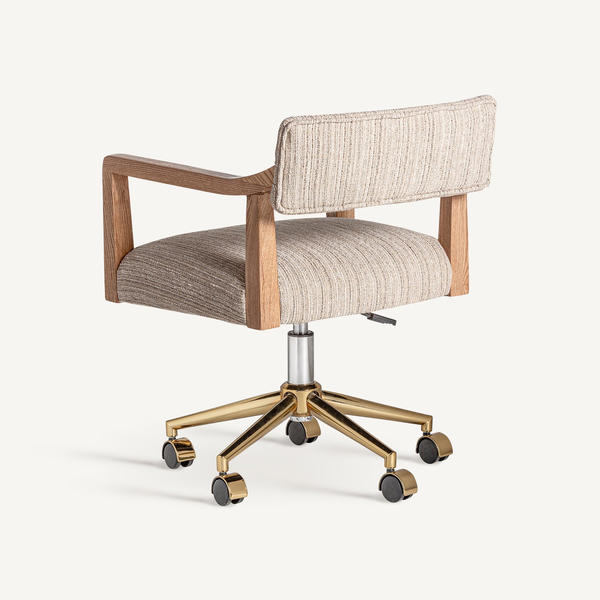 Silla giratoria de despacho elaborada en madera roble color natural tapizada en poliéster beige con un toque de acero en color oro.