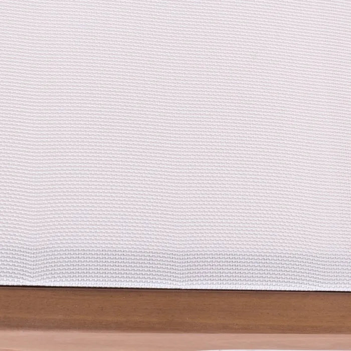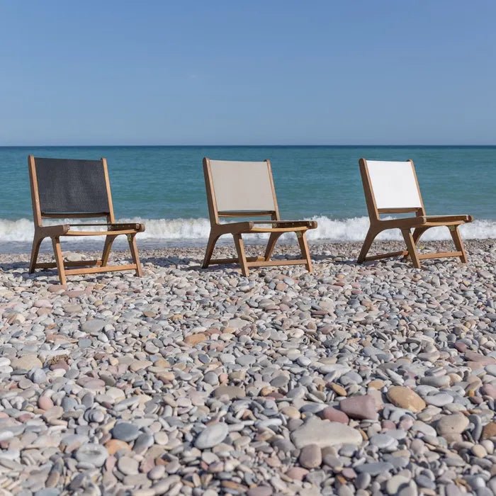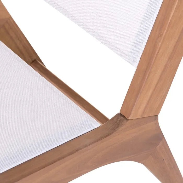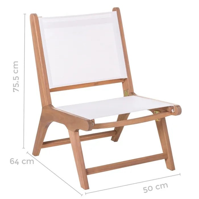 Original silla de exterior fabricada con madera maciza de acacia y tejido sintético de color blanco y marrón.