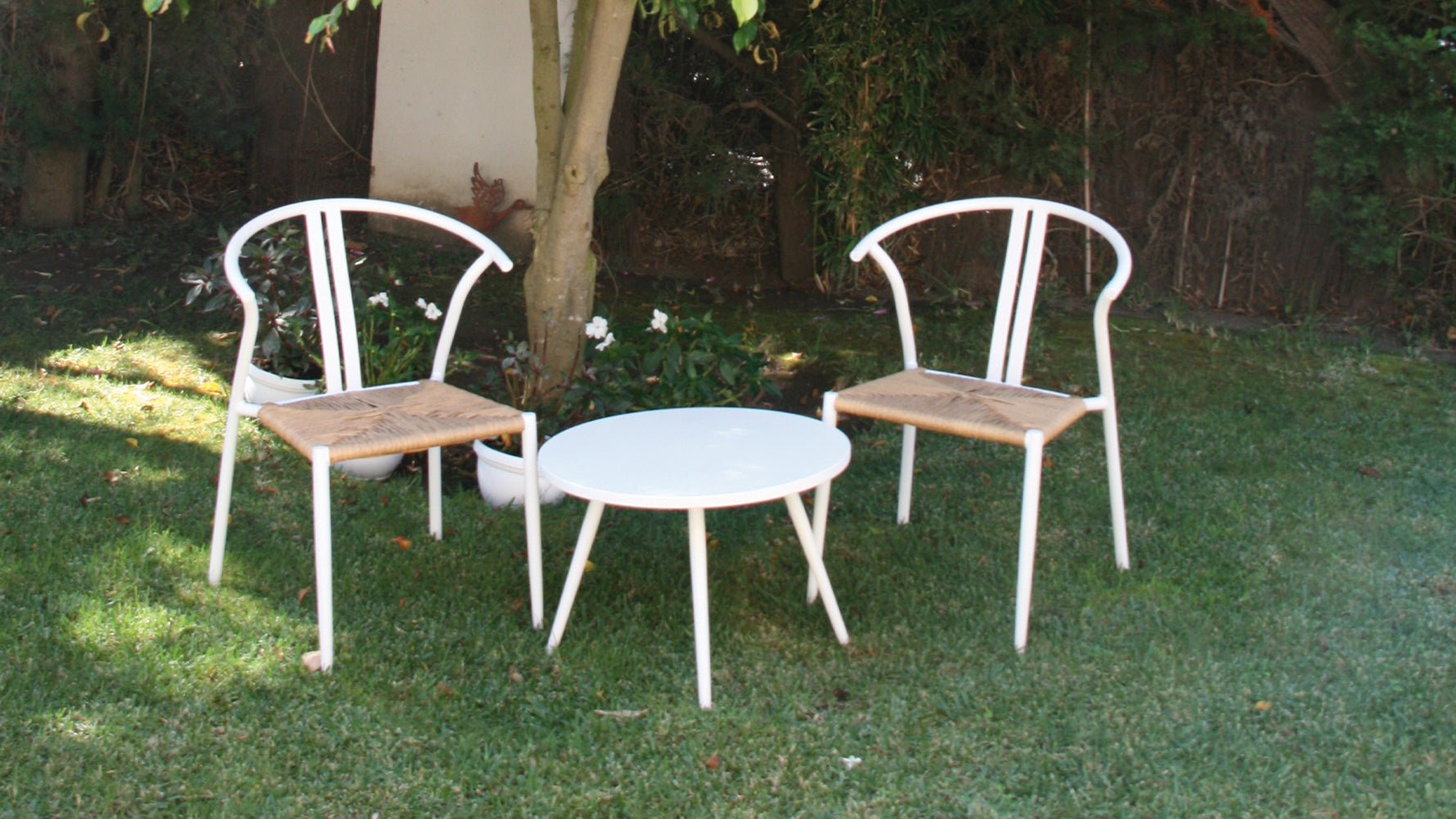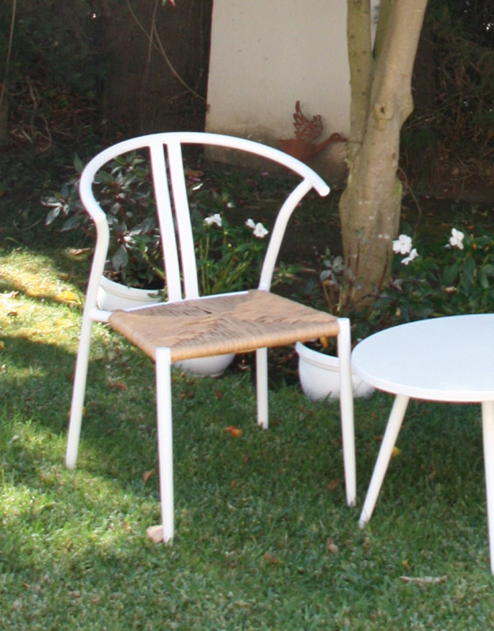 Silla de exterior apilable fabricada en aluminio blanco asiento en fibra sintética imitación enea color natural.
