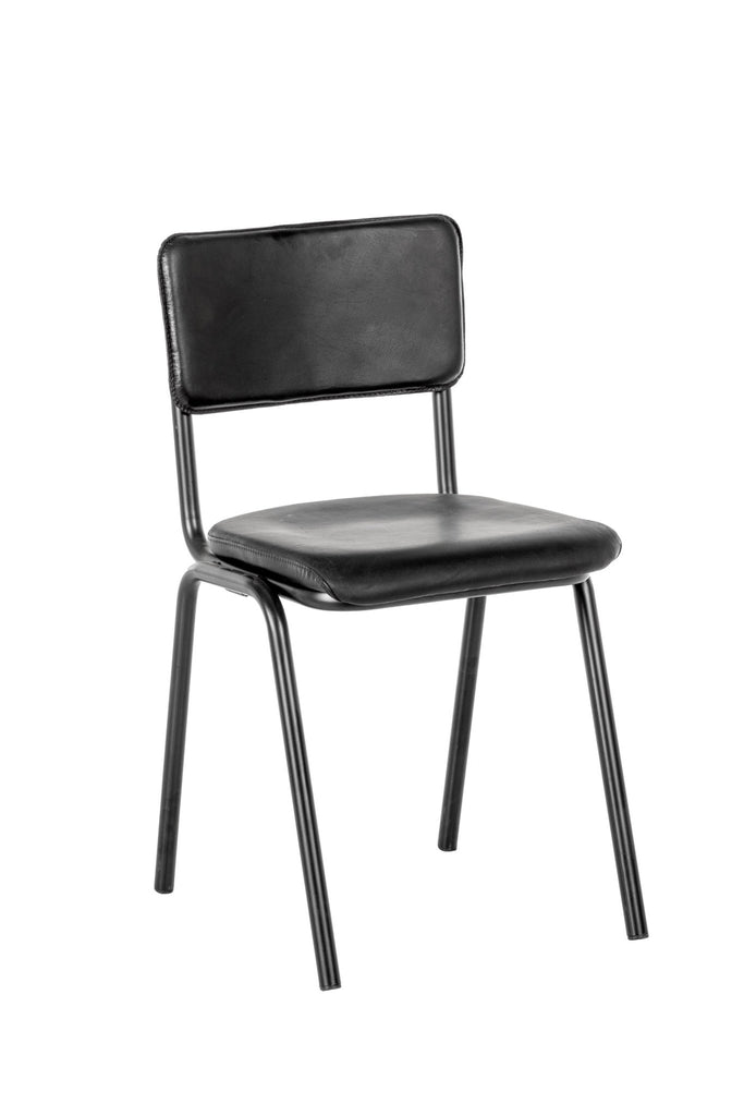 Silla real fabricada en hierro color negro y tapizada en piel de color negro mate.