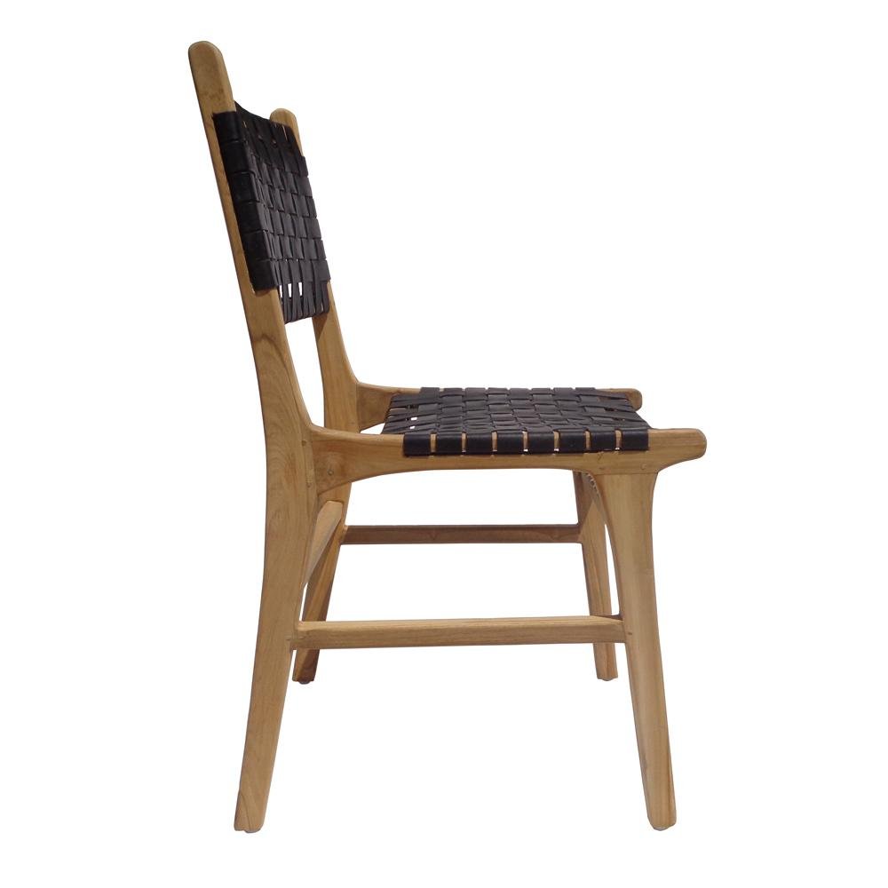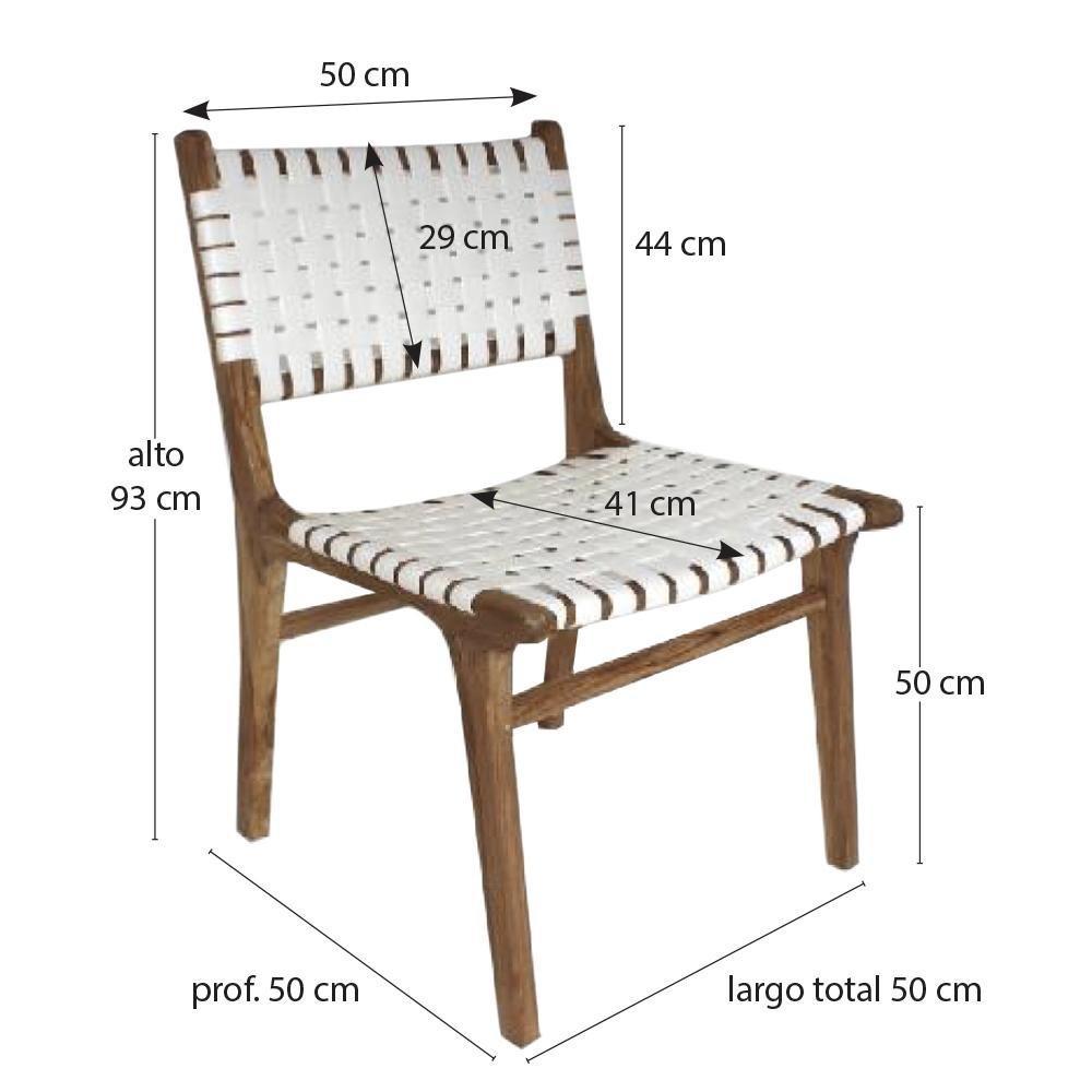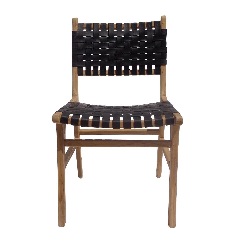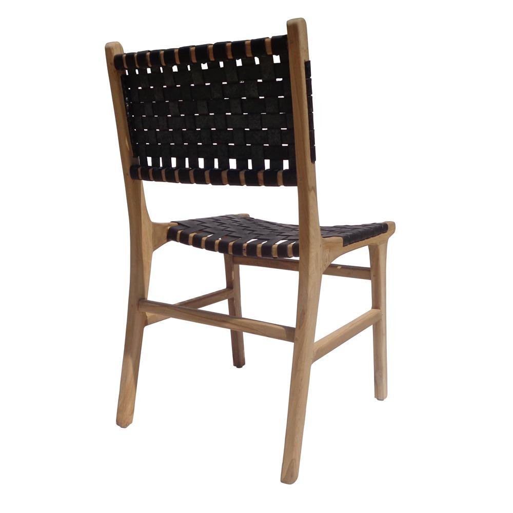 Silla con estructura madera de teca en color natural. Asiento y respaldo tapizado entramado tiras de cuero disponible en tres colores diferentes: negro, blanco y marrón.