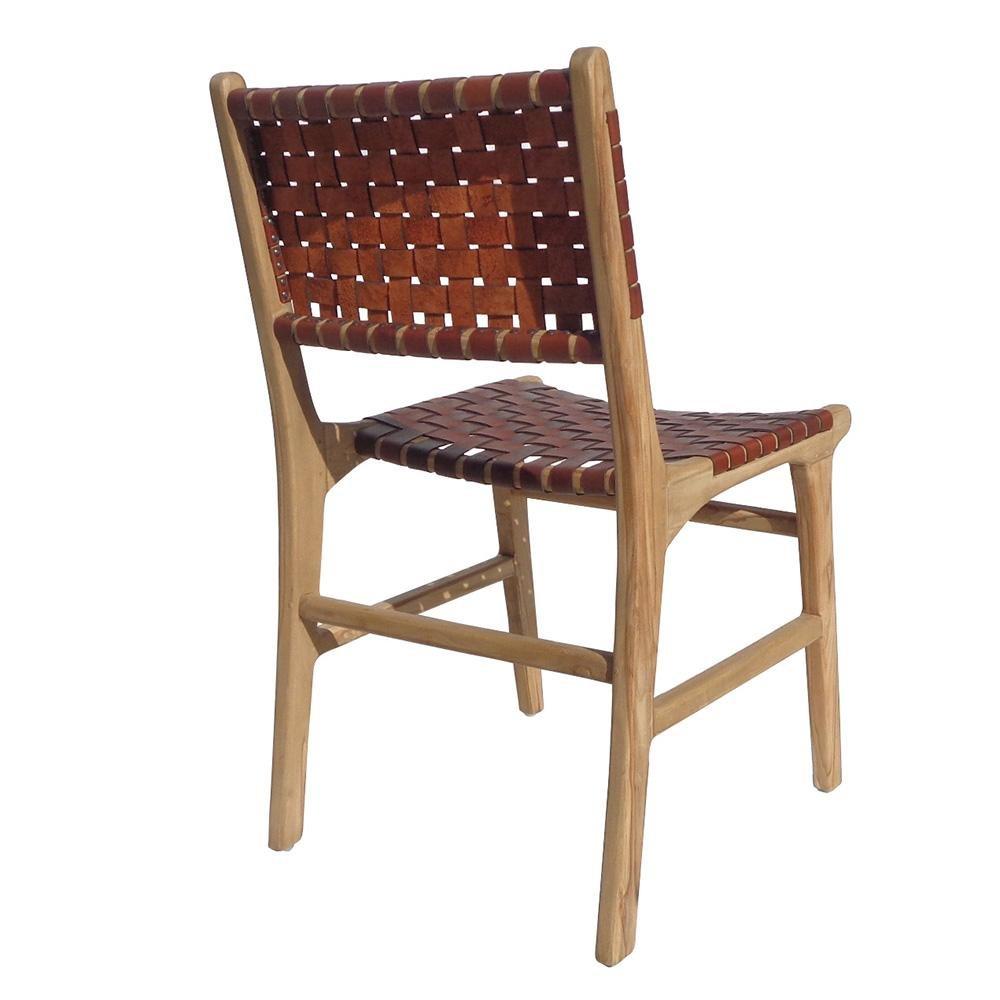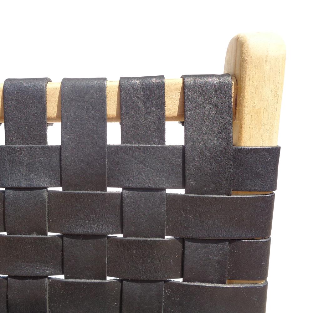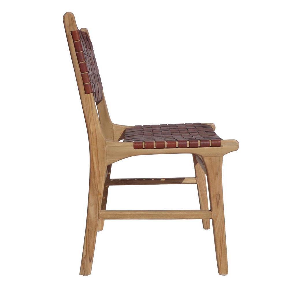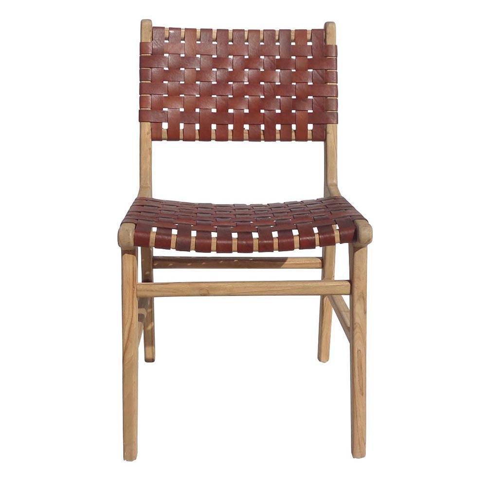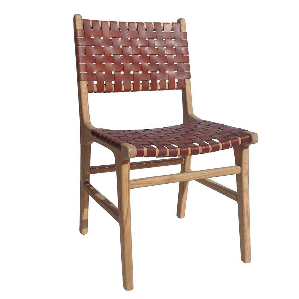 Silla con estructura madera de teca en color natural. Asiento y respaldo tapizado entramado tiras de cuero disponible en tres colores diferentes: negro, blanco y marrón.