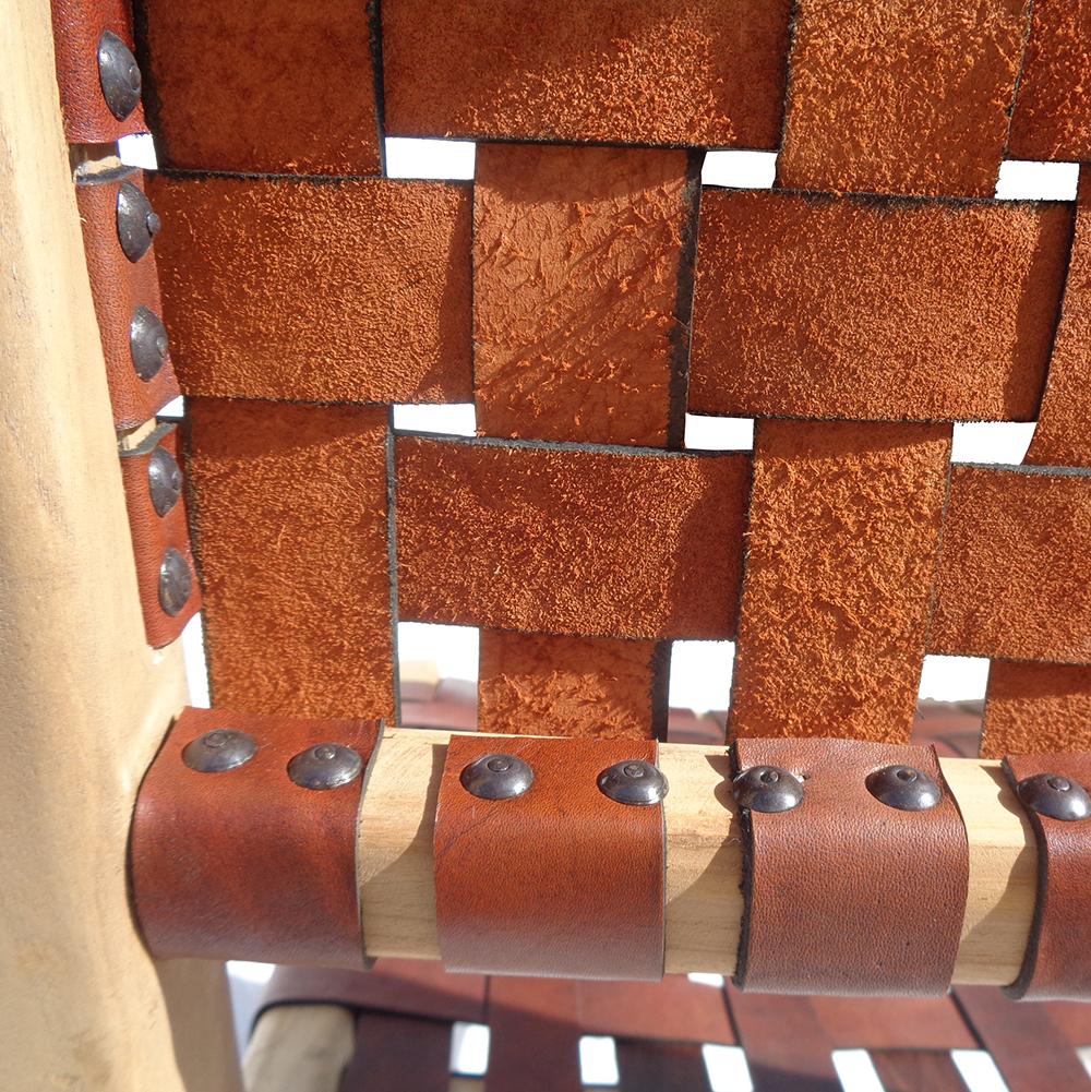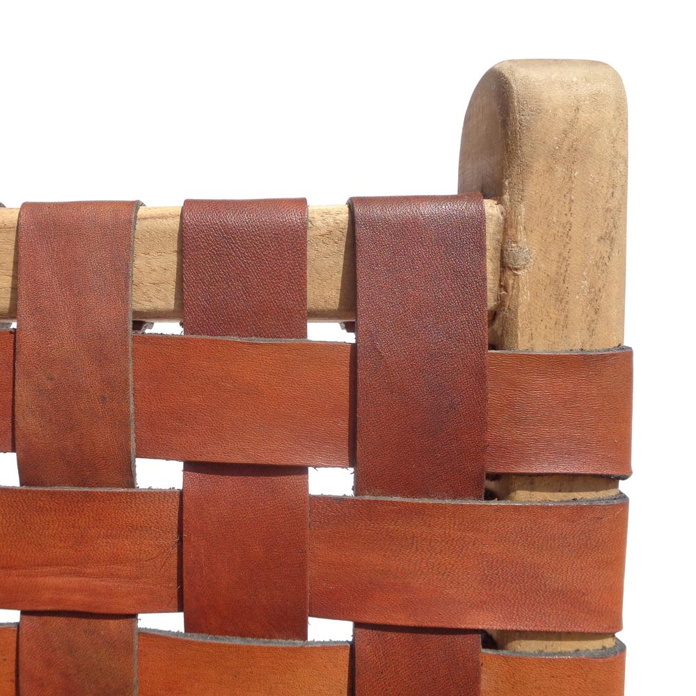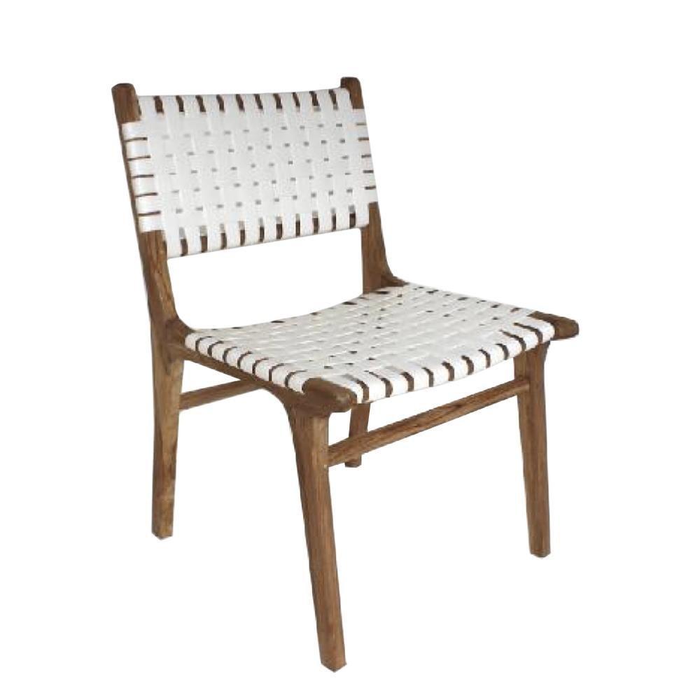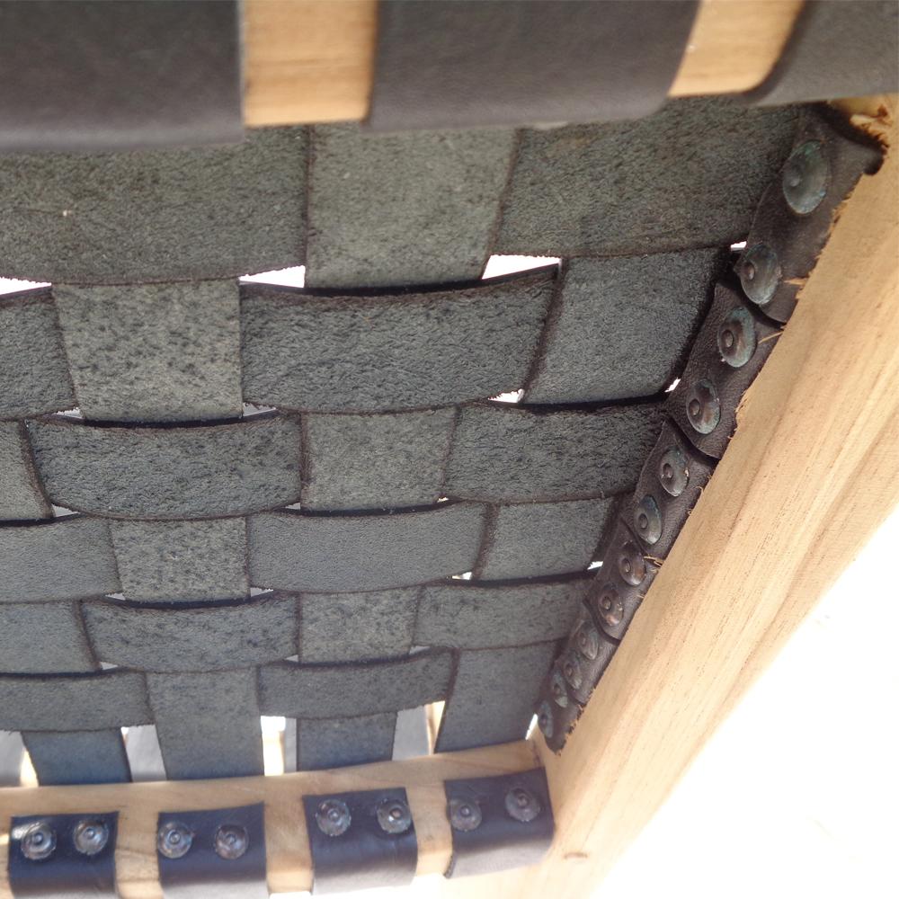 Silla con estructura madera de teca en color natural. Asiento y respaldo tapizado entramado tiras de cuero disponible en tres colores diferentes: negro, blanco y marrón.