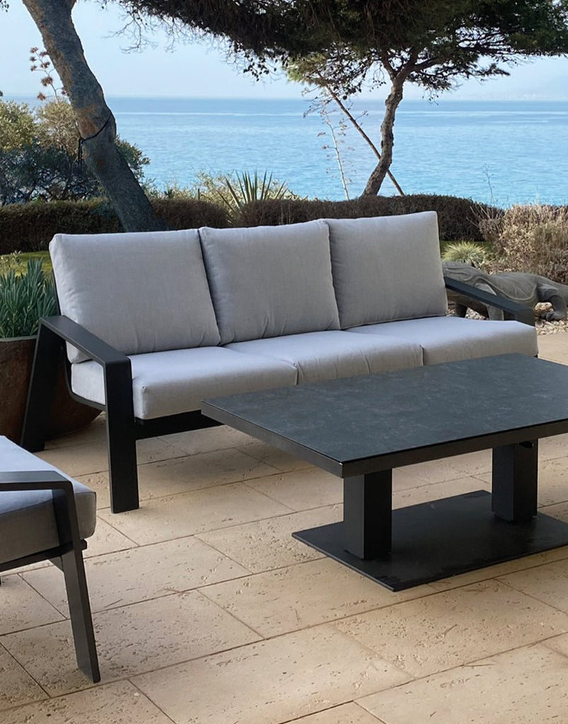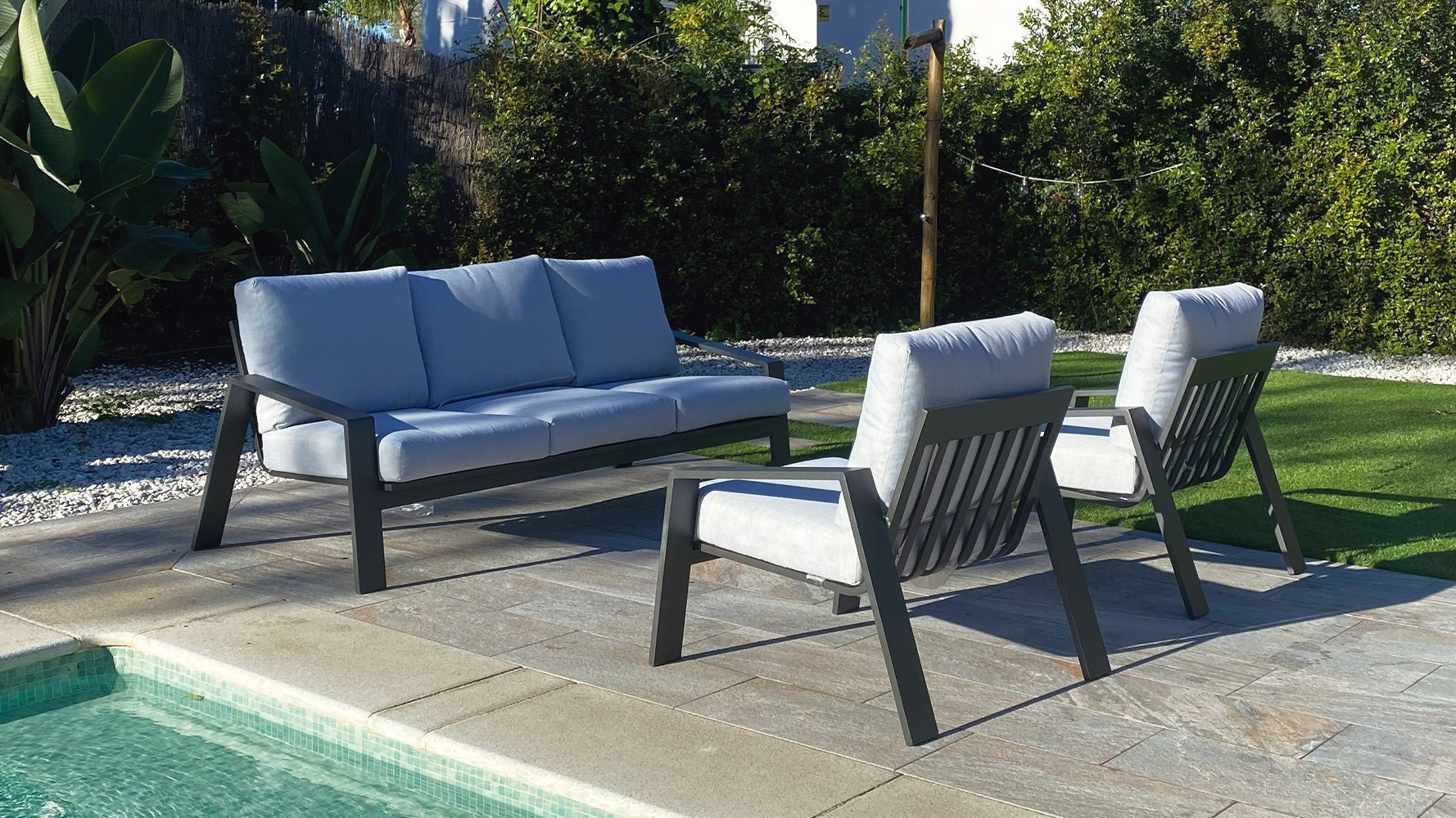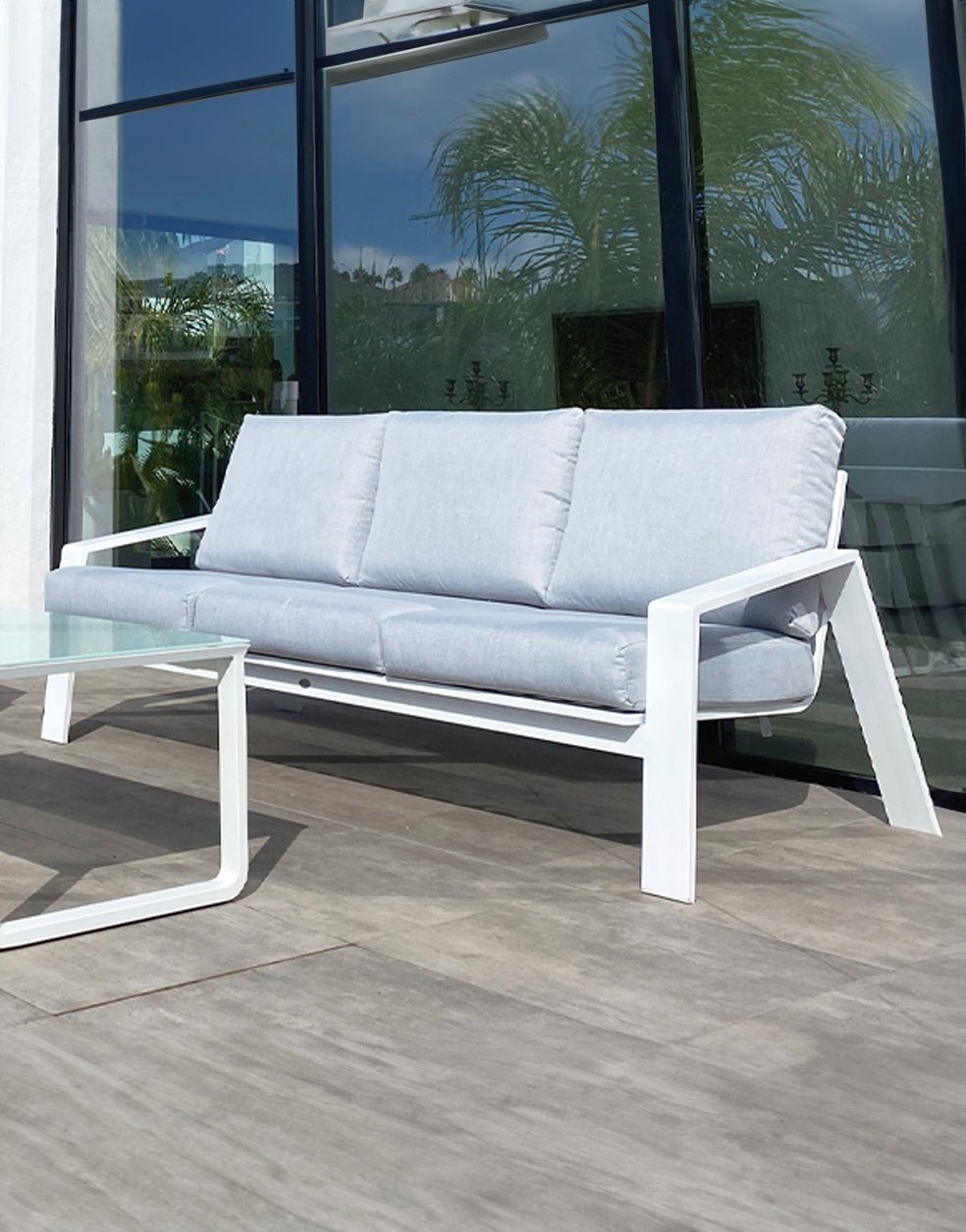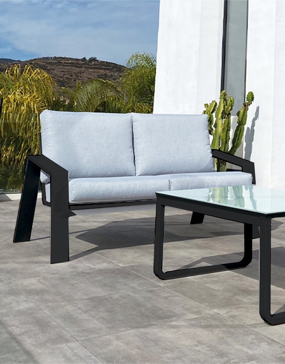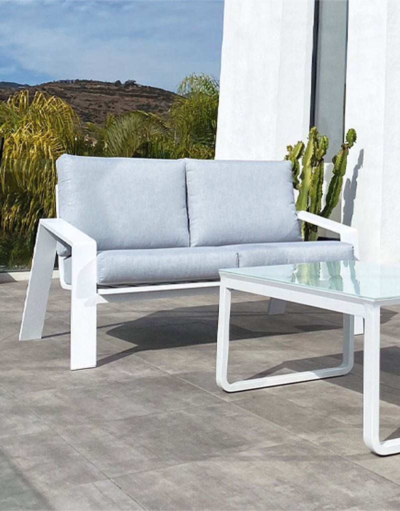 Sofá de exterior de 2 y 3 plazas fabricado en aluminio antracita o blanco con cojinería gris.