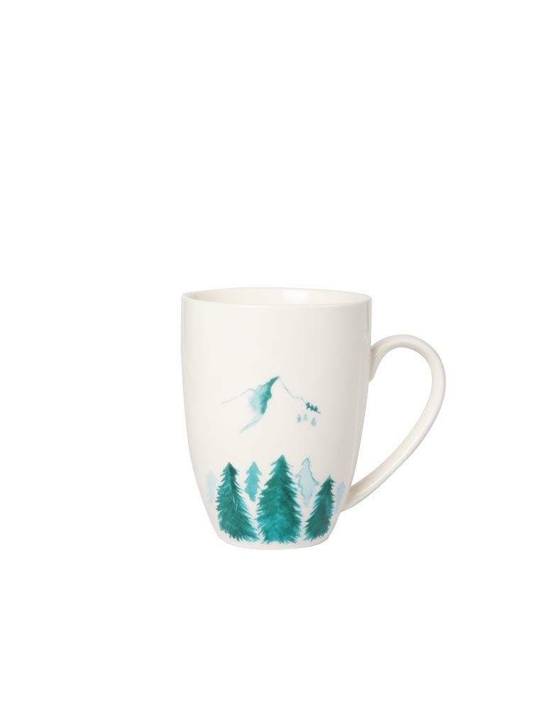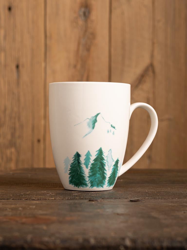 LIQUIDACIÓN - El set de 6 tazas Pirineos está fabricado en porcelana y pintado a mano con dibujos de pinos y montañas. Apta para el lavavajillas y el microondas.