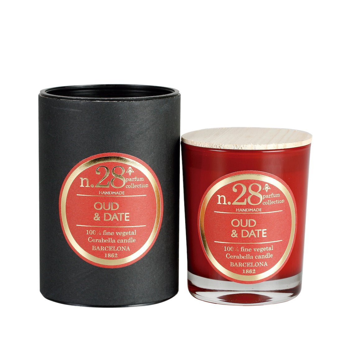 La vela Cerabella nº 8 con una fragancia intensa de dátil. Incluye una tapa de madera y un elegante estuche negro.