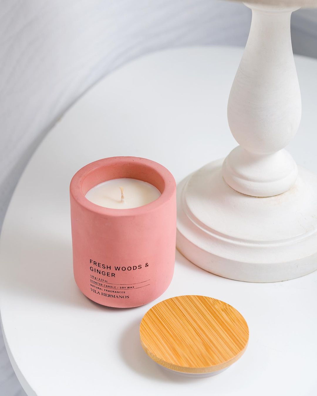 La fragancia Fresh Wood & Ginger está envuelta en vaso de hormigón color rosa. Pintado con pintura ecológica simula los colores de las tierras áridas de tonos terracota, cinceladas de por la erosión del viento y el agua.